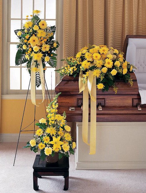 Our funeral package J consists of 3 traditional funeral flower pieces in assorted yellows.