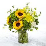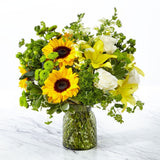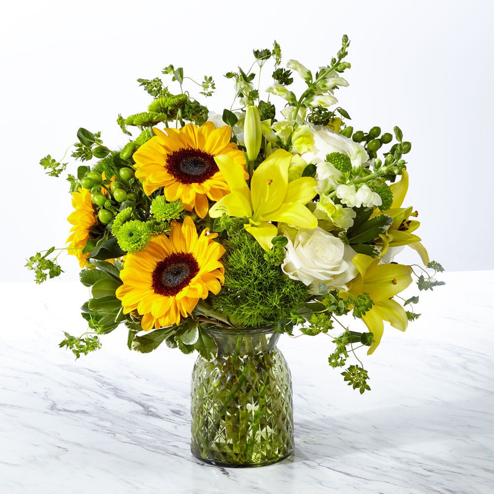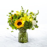 The Garden Grown Bouquet is a beautiful sunny blend of fresh yellow sunflowers, snapdragons, and lilies with white roses and lush greenery. This refreshing mix of flowers is designed in a vintage-inspired textured green glass vase. Upgrade this bouquet to a larger size and to make it a show-stopper.