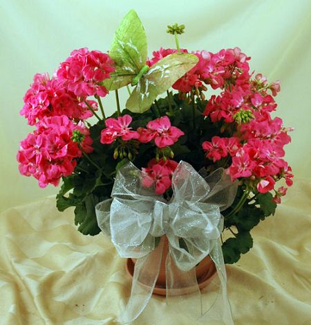 One of our own grown geranium plants in a colorful ceramic pot with fabric bow and Spring accents.