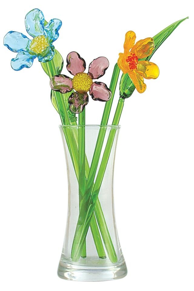 Hand made glass stems of assorted color cosmos in a glass vase.