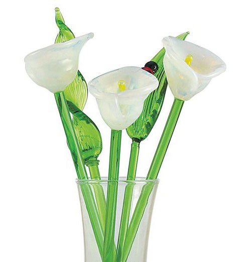The gorgeous allure of calla lilies capture in glass. Ideal for people with allergies, glass flowers are beautifully hand crafted using a small flame and beautifully colored glass rods. Set includes three white calla lilies and foliage stems. A perfect accent for any office or home.