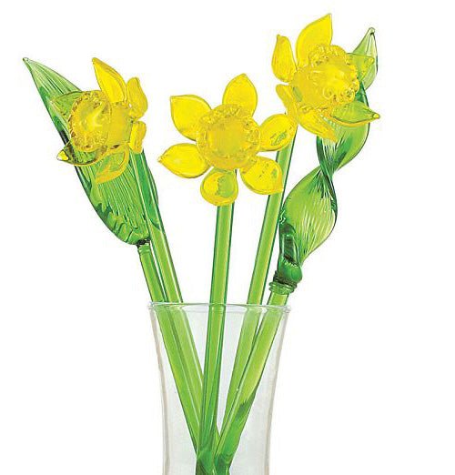 Welcome spring with these beautiful glass daffodils. Perfect for people with allergies, glass flowers are beautifully hand crafted using a small flame and beautifully colored glass rods. Set includes three sunny yellow daffodils and foliage stems.