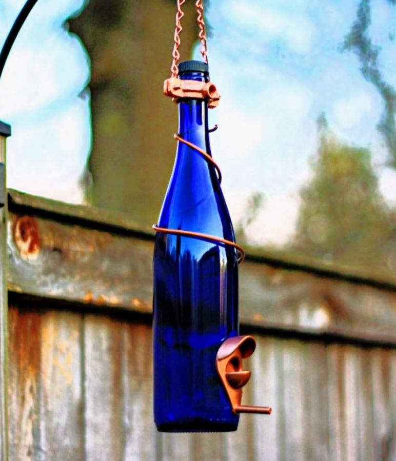 Blue Glass Wine Bottle Bird Feeder