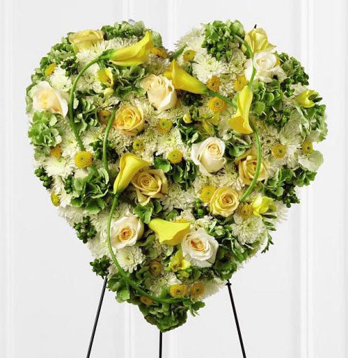The Glowing Ray Standing Heart is an exquisite way to show your love and affection for the deceased. A collection of sunlit blossoms, including, yellow roses, freesia, mini calla lilies, and button poms are accented with green hydrangea, white chrysanthemums, cream roses and green hypericum berries to form a sophisticated heart-shaped arrangement that offers a bright and elegant expression of caring kindness for their final goodbye. Displayed on a wire easel.