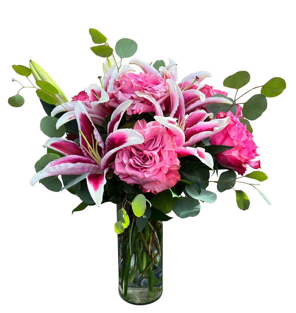 A blushing expression of beauty's sweetness, this bouquet speaks of your softest sentiments. Premium pink roses are eye-catchingly arranged with fresh stargazer lilies and accented with seeded eucalyptus greener in a clear glass vase.
