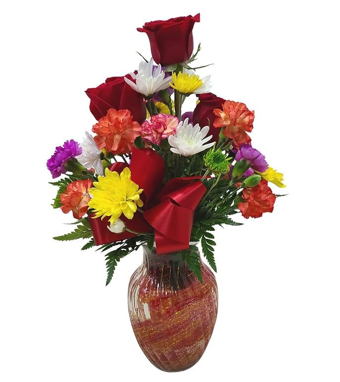 Bring the warmth and color of a tropical sunset to someone’s day with our Guam Sunset Bouquet—a radiant mix of romance, joy, and island charm. This vibrant arrangement features lush red roses paired with a cheerful medley of brightly colored carnations, daisies, and mums. A bold red satin bow adds a perfect finishing touch, all beautifully arranged in a stunning swirled glass vase that sparkles with sunset-inspired tones of gold, orange, and red.