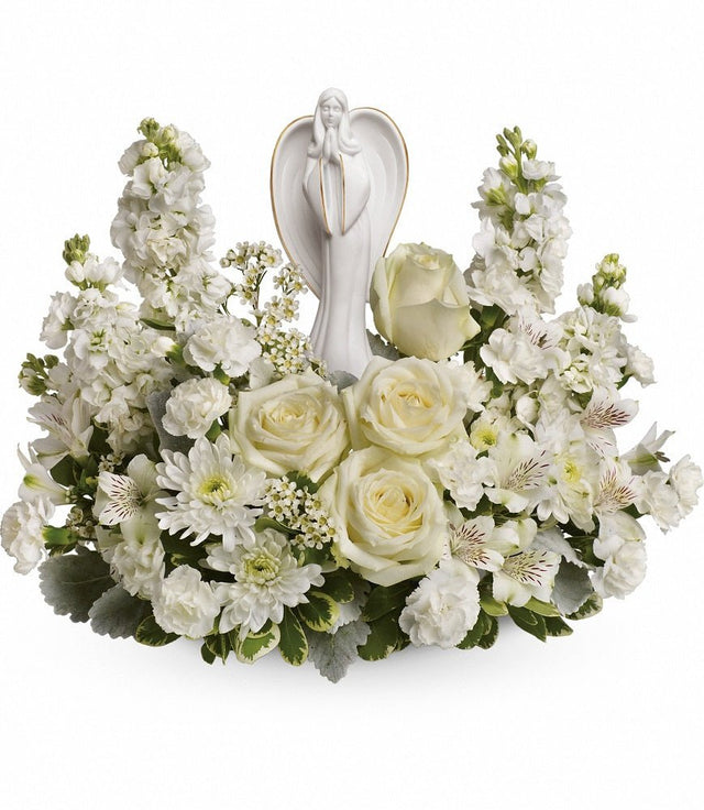 Guiding Light Bouquet is made with an assortment of white flowers which may include roses, stock, alstroemeria, mini carnations, and cushion pom pons. The flowers are designed in a low dish that can be displayed on a table at a funeral service or in the recipient’s home. The flowers spring up around a ceramic keepsake angel. The serene angel has her hands clasped in prayer as a reminder of the angels watching over all. Guiding Light is a versatile bouquet because it is appropriate to send to a funeral service and the recipient can display it at home after the service. White flowers coordinate well with any other arrangements the family may have chosen.