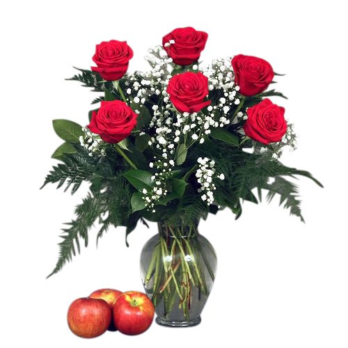 6 long stem roses arranged in a glass vase with fancy greens and babies breath. Known for their romantic beauty, roses are most popular for anniversary but can be sent for any occasion. Different colors have different meanings. Please specify color.