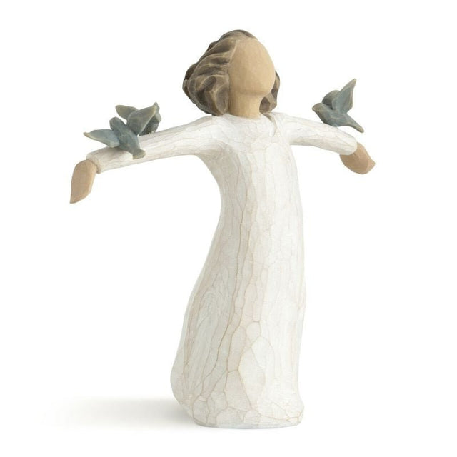 The Happiness Willow Tree encourages the appreciation of internal happiness. Hand-carved figures, designed with an earthy color palette resin, reveal this uplifting and optimistic expression with simple body gestures. Standing tall, arms open with her palms toward the sky, and head lifted slightly, almost as if this female figure is appearing to be inhaling with content, happiness, and relaxation. On the arms are 3 lovely birds, that have the grace and gentleness of a dove. This stunning design is truly an acknowledgement of individual strength, personal growth, and overall love of life. A beautiful and uplifting symbol of positivity and overall happiness that can be displayed and enjoyed within any home or office decor style, on any tabletop or desktop, all throughout the year! This can be gifted for any occasion, especially celebratory occasions like birthdays, anniversaries, new homes, new jobs, and new babies!