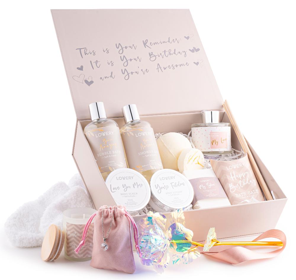 “Happy Birthday Sweetheart” is the prettiest pink bath set that includes everything needed to treat your sweetheart on her birthday. From spa products, to fragrances, to the comfiest socks, Happy Birthday Sweetheart is a one-stop-shop for an all-inclusive birthday gift.