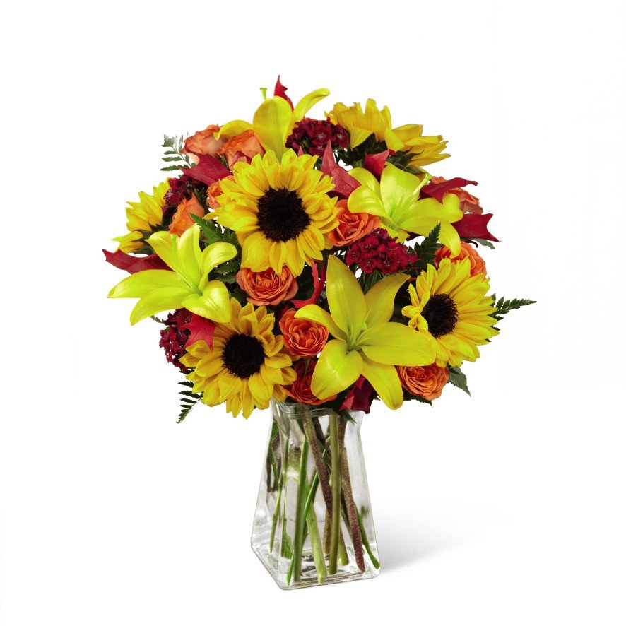 Our Harvest Heartstrings Bouquet brings sunlit autumn beauty straight to their door. Unforgettable mini sunflowers catch the eye at every turn surrounded by yellow Asiatic lilies, red dianthus, orange spray roses and lush greens to create a stunning fresh flower arrangement. This vibrant mix of fresh cut flowers is sure to make a great statement for any occasion. Presented in a clear glass gathered square vase and accented throughout with red glycerized oak leaves, this flower bouquet is set to make an excellent birthday, thank you, get well or Thanksgiving gift. Can also be used as a colorful centerpiece!