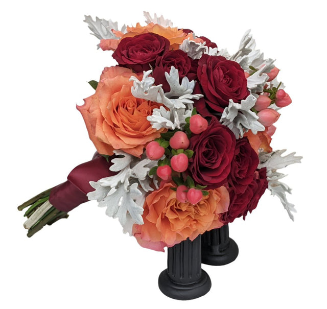 The Harvest Homecoming Clutch was designed with today’s popular formal dress colors in mind. In recent years, I’ve seen a lot of guys and gals wearing trendy colors like burgundy, copper, brown, and emerald. This bouquet complements all of those colors, and provides an alternative to the common white or blush bouquet. I would recommend this bouquet for Homecoming dances because it includes the colors of the fall season. This bouquet would look beautiful in outdoor photos!