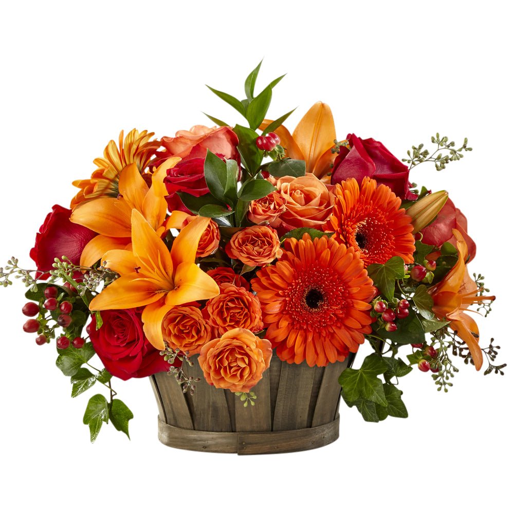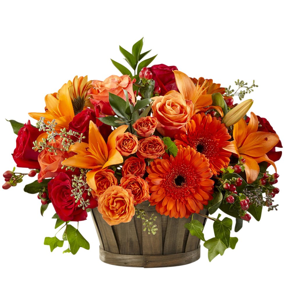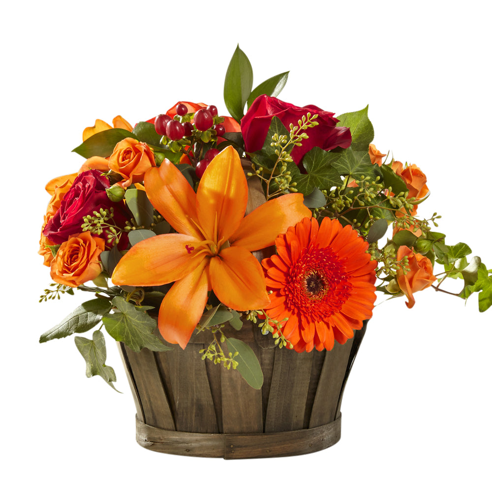 A nice change of pace compared to the traditional vase arrangements we see for Fall occasions. This vibrant basket arrangement will stand out at the center of your table.
