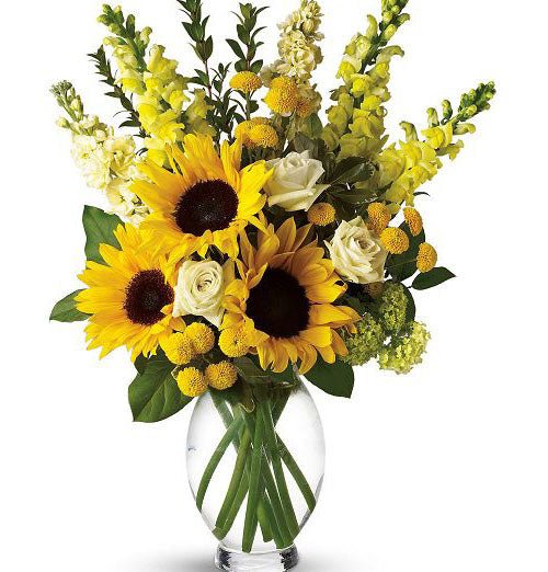 Here comes the sun...and a whole lotta lovely flowers! This large bouquet of mixed yellow flowers is a sunny way to say, "Get well soon," "I miss you," or simply, "Hello!" Great for any occasion this large vase arrangement is filled with yellow and cream flowers.
