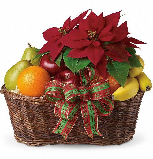A delicious assortment of seasonal fresh fruit in woven, wicker basket with a bright and festive poinsettia and decorative bow. A winter favorite year after year!