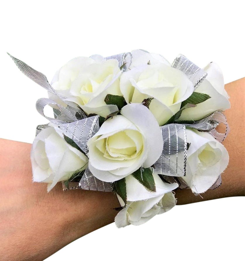 If you are unsure as to what color corsage to select to match your dress, go with white.  This neutral color works great regardless of your dress color.  And with the addition of silver ribbon, you will have some extra flair to make you stand out!