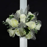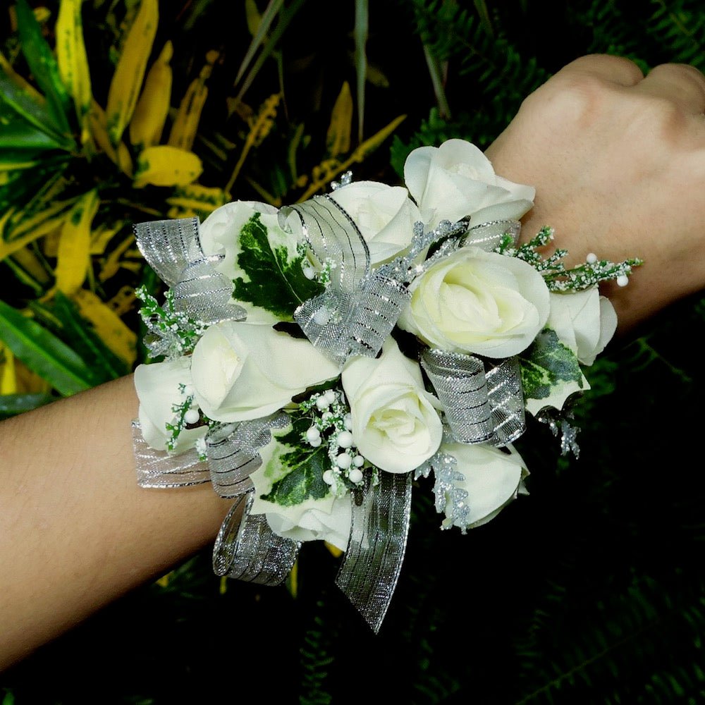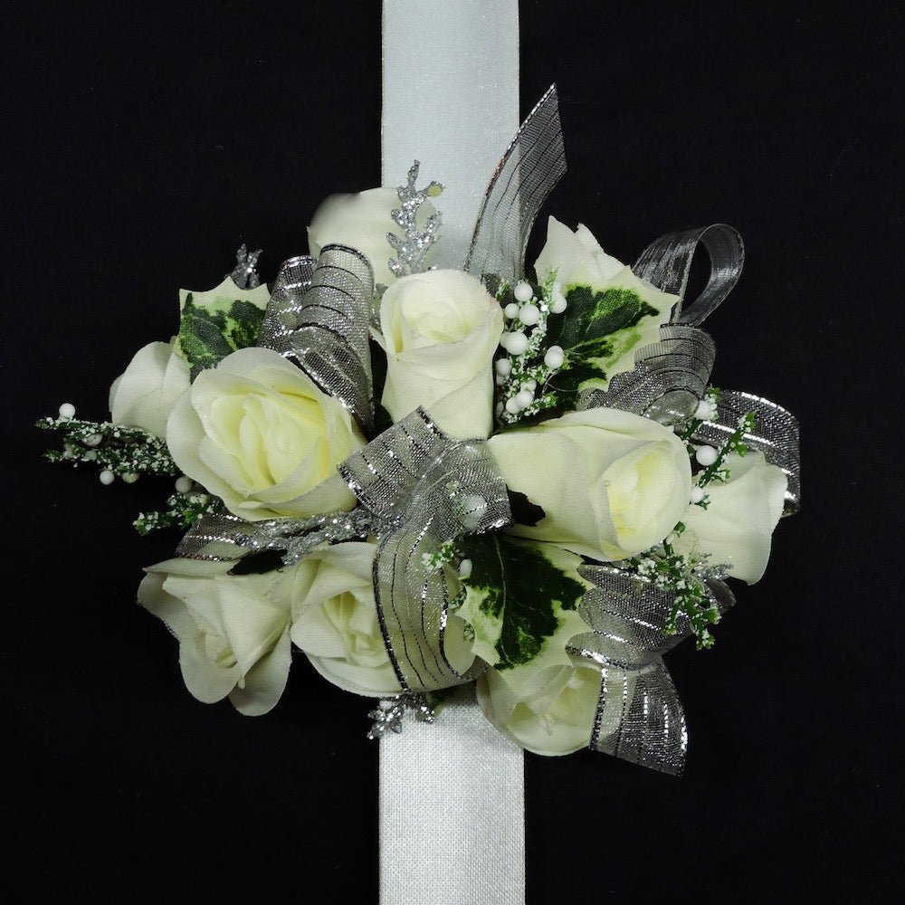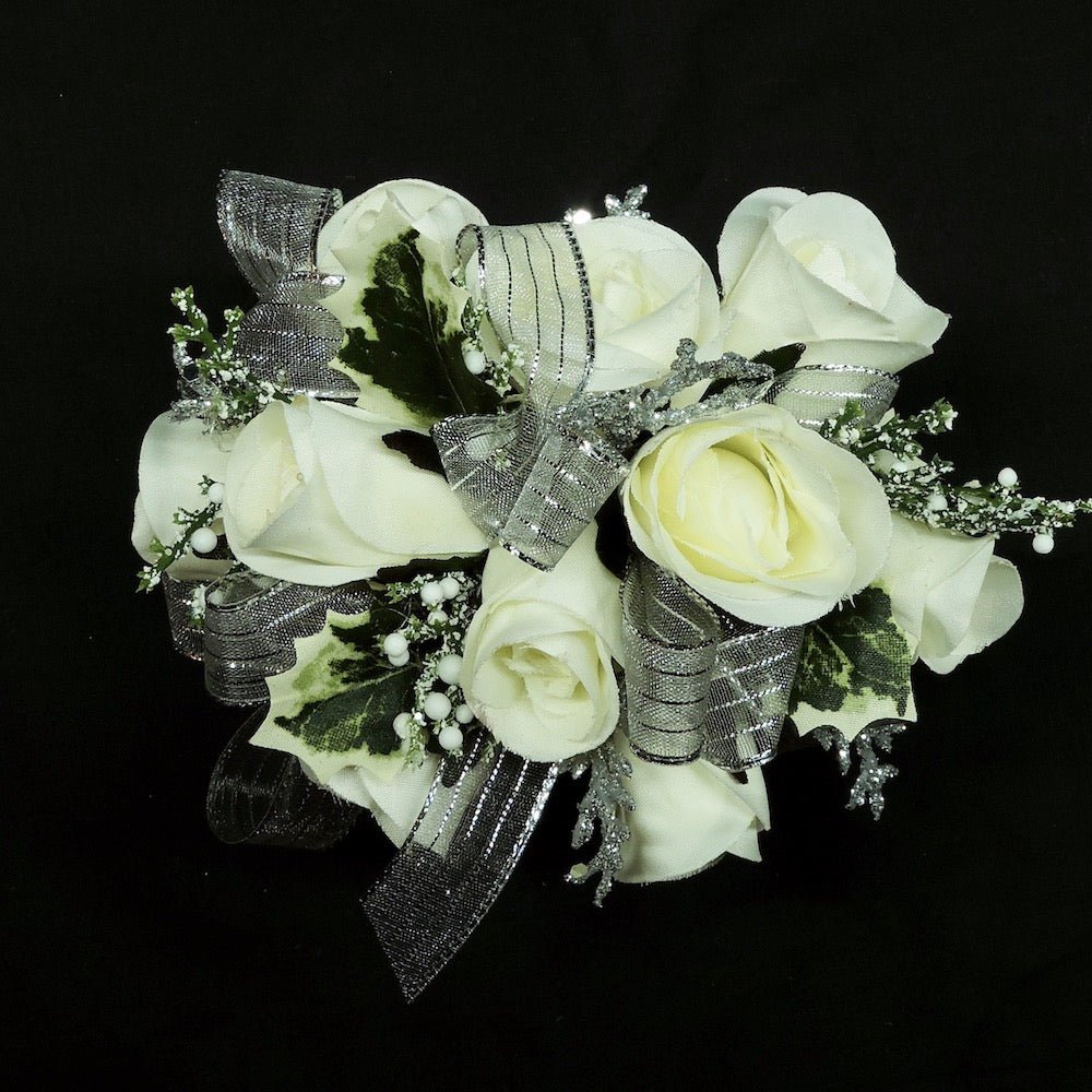 The White and Silver Silk Flower Corsage is all you need to be set for your Winter formal or holiday dance. Our designer creates this neutral colored corsage with creamy white silk roses, snowy white accents, variegated holly stems and a sheer silver ribbon throughout.