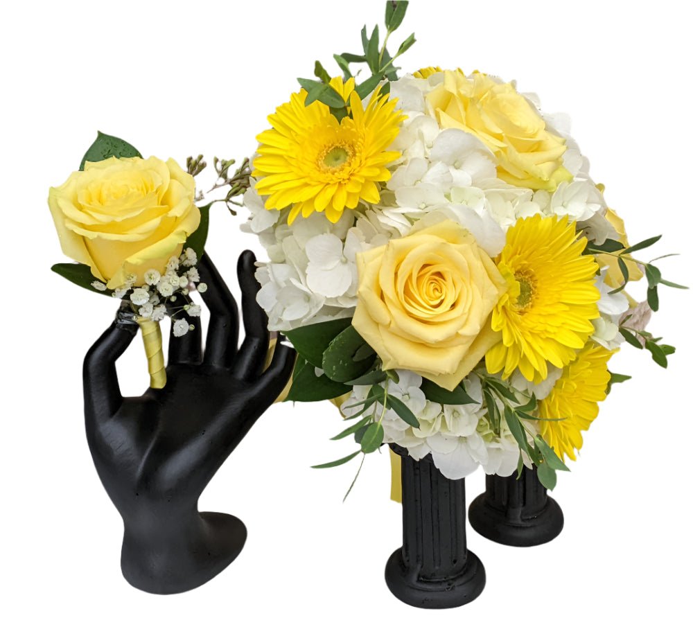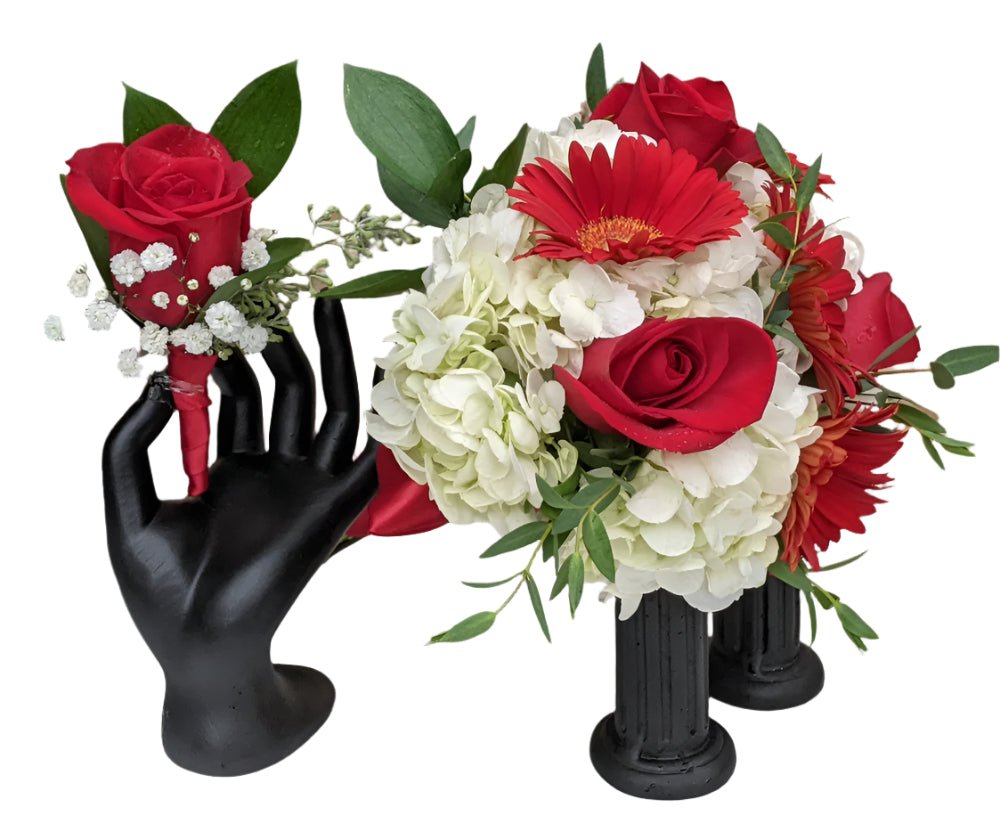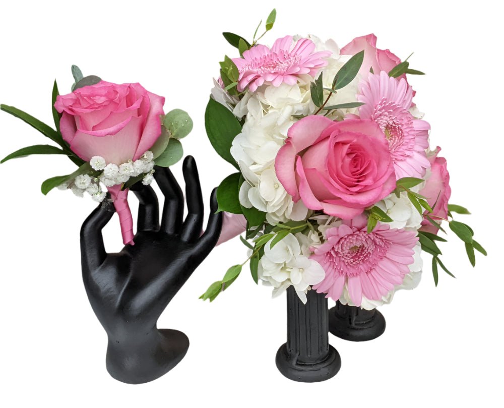 A top choice for proms and dances throughout the year, this package includes a handheld clutch bouquet and matching boutonniere in your choice of color.