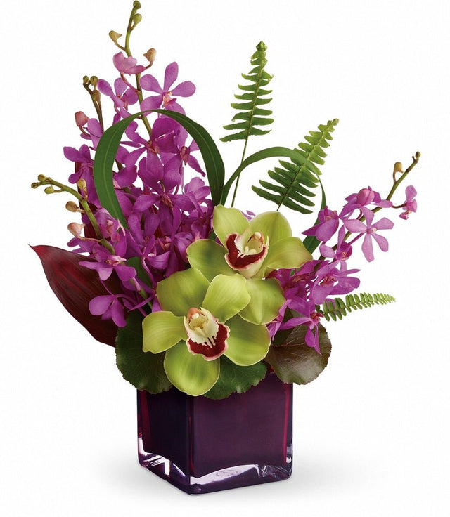 Island Princess features purple and green tropical blossoms. Every gal deserves to feel like a princess on her birthday, so bring the feel of a tropical retreat to the celebration. Beautiful blooms in a funky cube are sure to please!