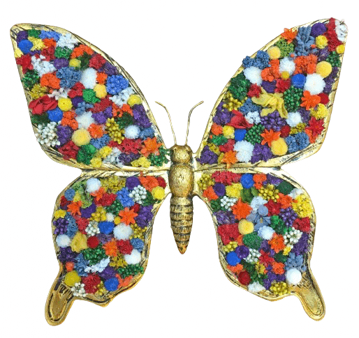 This beautiful bright explosion of color makes this large butterfly a definite showstopper. If you or someone you know would love a conversation piece, this is the one! Measuring 9” X 10”, this gorgeous butterfly piece will mesmerize you plus anyone who sees it. Our artist designs these pieces exclusively for Kremp Florist, so you can rest assured you will never see anything like it anywhere else. There are so many colors and textures, you probably can’t count how many. Best of all, the Le Grande Butterfly is so adapable to any environment. She can be displayed on a tabletop or shelf, plus she has a removable easel back for hanging.