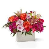 Light of My Life Box is an arrangement that puts a new twist on the classic roses or lilies that you might choose for birthdays and anniversaries. Light of My Life brings vibrant colors of orange, pink, and purple to this design. The flowers are arranged in a compact style that looks beautiful when displayed on a coffee table or dining table. The colorful flowers stand out against the rectangular white box that can be reused to hold fresh flower arrangements or houseplants. Give Light of My Life to your mom, your friend, your significant other: the one who brings so much light to your world!