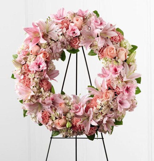 The FTD Loving Remembrance Wreath is an elegant wreath standing spray arrangement that channels your fondest memories and love for your friend or loved one's memorial. Assorted pink flowers, including roses, fragrant Oriental lilies, gladiolus, hydrangea and carnations are arranged together with lush greens in an elegant display of grace and beauty. This arrangement is delivered with an easel for display.