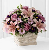 The Loving Sympathy Basket is a wonderful way to convey your condolences for their loss. Lavender roses, pink Asiatic lilies, lavender daisies, purple matsumoto asters, green hypericum berries and lush greens are sweetly arranged in a square whitewash basket to create a lovely way to offer you caring kindness during this trying time.