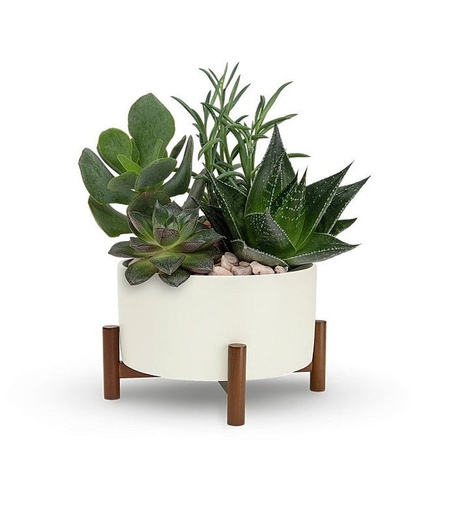 The Mid-Century Garden includes four live succulent plants and the soil is covered with a base of attractive stones. The white, circular container gives this gift a mid-century modern feel, with its sleek lines and smooth ceramic finish. The container sits on a wooden base for a look that is modern and retro at the same time! This planter is a good size to display on a coffee table or end table. The succulents make a low maintenance gift for anyone from the experienced gardener to a plant newbie looking to spruce up their home. Dads and grads will love the cool texture of the spiky succulents and the easy style of this fashionable container.