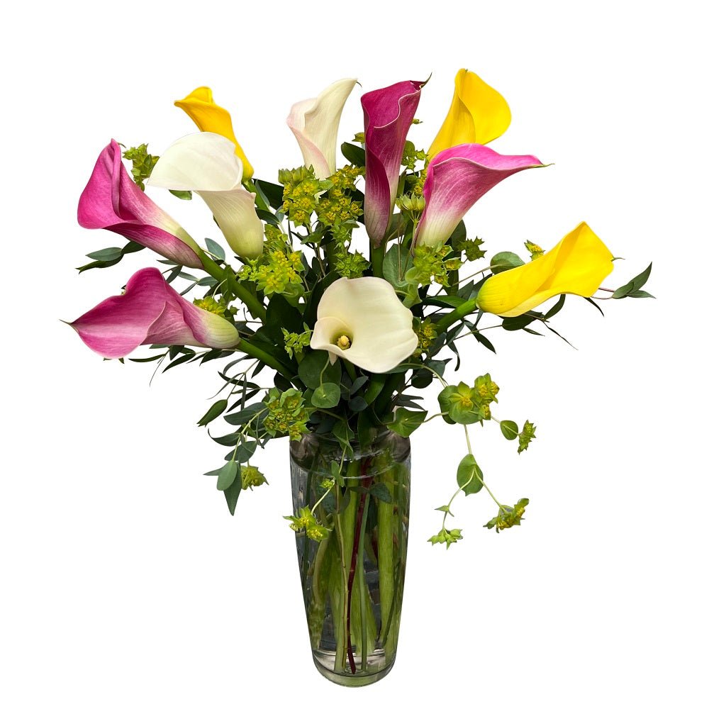 Stylish, modern and vibrant! Beautiful miniature calla lilies arranged in a stylish vase with decorative filler and fancy greens. Use as a centerpiece, decorate a desk, or just brighten someone's day!