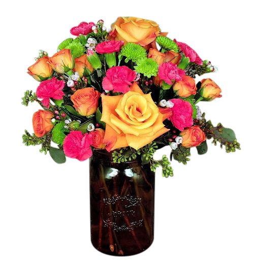 Mom's mason jar flower bouquet of roses, lilies and more in orange and pink Large