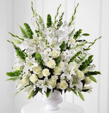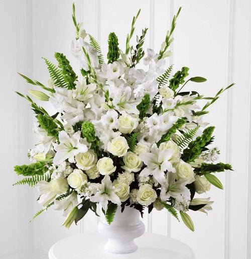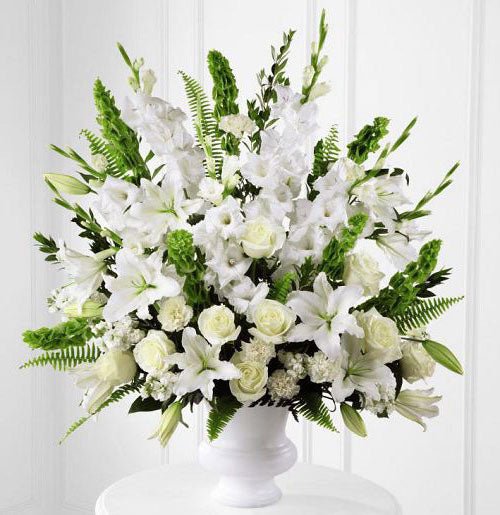 The Morning Stars Arrangement is a brilliant expression of peace and soft serenity. White roses, carnations, gladiolus, stock, and Oriental lilies are accented with the bright green stems of Bells of Ireland and a gorgeous assortment of lush greens, while seated in a white designer plastic urn to create a beautiful way to honor the life of the deceased.