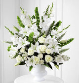 An all white funeral flower arrangement in container featuring roses, lilies, carnations and more.