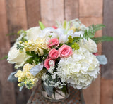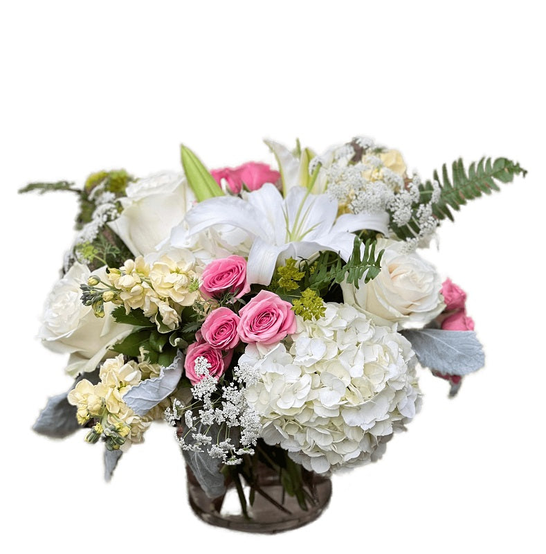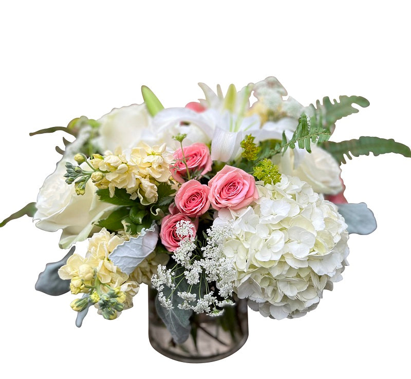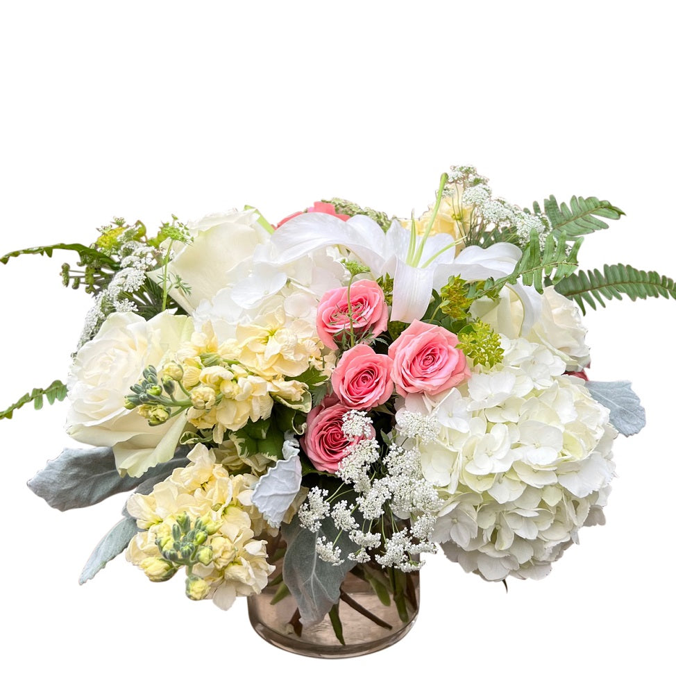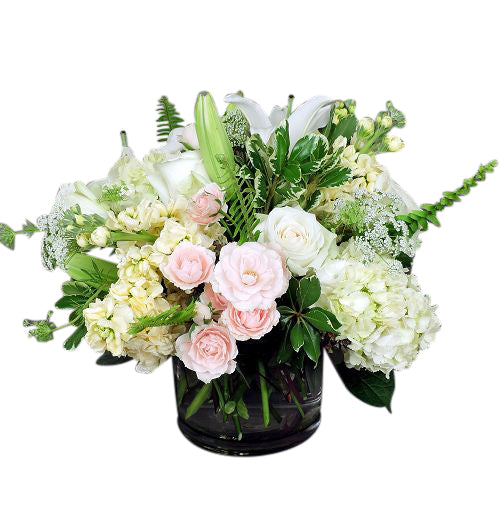 Bring the gardens indoors with a lush assortment of creams, whites and pale pinks in a glass cylinder. Flowers such as spray roses, hydrangea, stock and lisianthus make up this gorgeous garden bouquet.