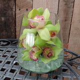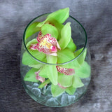 Elegant glass hurricane vase filled with blooming cymbidium orchids and decorative design accents.