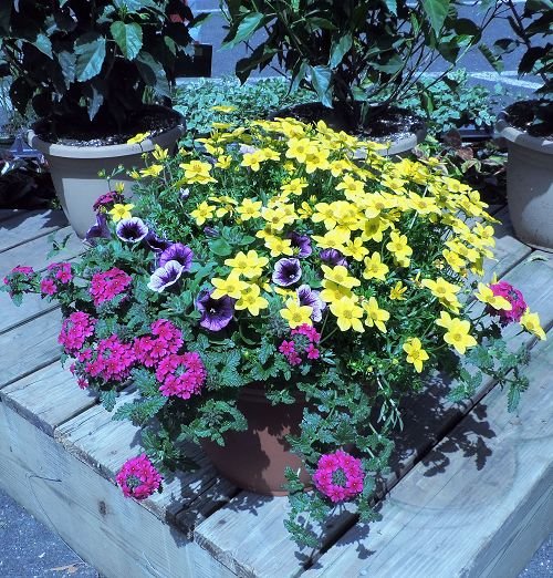 Straight from our local greenhouses, our colorful blooming patio planters are the nicest around! Long lasting and full of blooms, these lightweight terra cotta colored planters will last well into the Summer! Our plant specialists will choose the nicest variety available. Don't forget to water them daily!