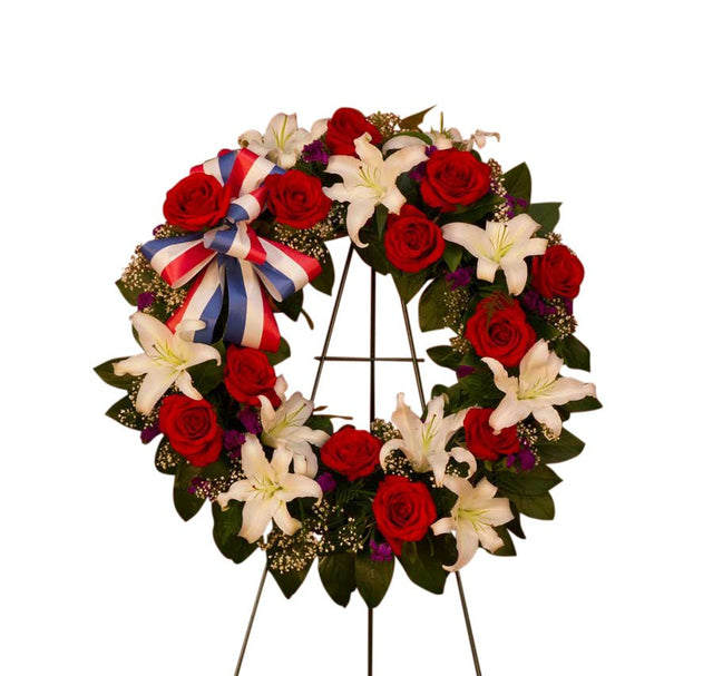 This Patriotic Wreath makes a memorable statement of red, white and blue with a decorative patriotic bow. Flower varieties may include red roses, white lilies, blue statice, babies breath and decorative foliage.
