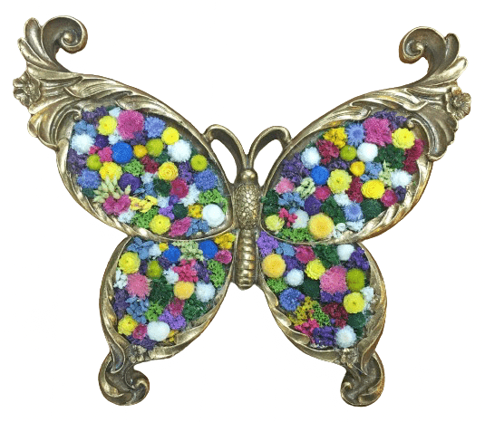 Ahh, this piece reminds us of the transformation from the homely caterpillar into the  beautiful butterfly! Since the artist loves all things French, we all probably know that  papillon means butterfly in French. This piece started out as a butterfly mirror, dime a  dozen, right? Nothing special, until now! Our artist took a standard screwdriver, dug out  the mirrors without wearing protective eyewear, and implanted these beautiful and bright  preserved flowers instead! Now how is that for dedication? You will not be able to find  anything like this anywhere else in the world but here at Kremp Florist. Even better, the  petite papillon has a removable easel back. This is an added benefit because she can  be hung just about anywhere, measuring 8 “ X 9”, or displayed on a tabletop or shelf.  Wouldn’t it be great to display this somewhere you pass by or sit a lot to look across to  remind yourself of the miracle of transformation?