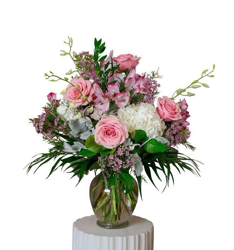 The Pink and White Funeral Vase provides natural beauty for any funeral service and is the perfect size for the famiyl to take home after the service. The soft shades of pink and white convey the gentle spirit of your loved one/friend/coworker.