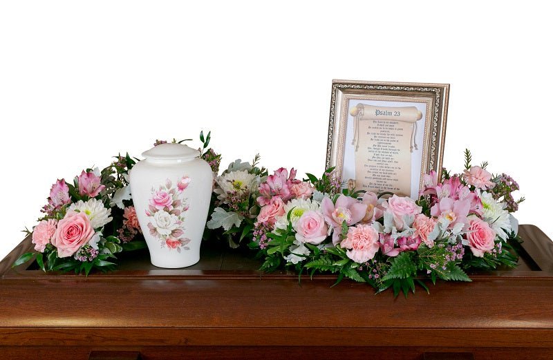 The Pink and White Flower Urn Surround is a captivating display of fresh flowers in an S shape. This garland is nestled around the urn to create a beautiful burst of color. A second space is perfect for framed photograph or similar. Roses, carnations, orchids, Peruvian lilies and more are highlighted in this display.