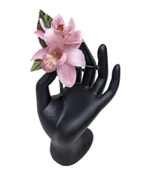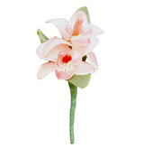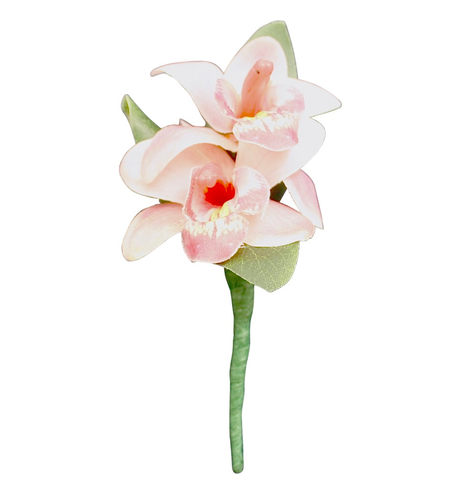 The Pink Silk Orchid Boutonniere is sized to perfectly fit a suit or tux jacket with two mini cymbidium orchid blooms. Check out the detail on these silk flowers with life-like variation throughout their soft pink petals. The boutonniere is finished with subtle accents of faux greenery. The unique pink orchids make this boutonniere a new take on a classic and simple boutonniere. The soft colors are complementary to many formal outfits. The Pink Orchid Boutonniere is the perfect pair to the Pink Orchid Corsage so couples can coordinate their prom or wedding style.