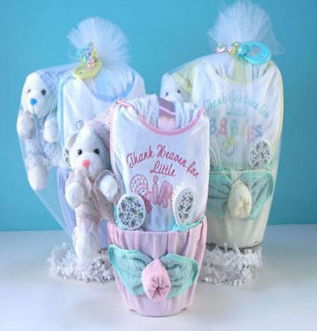 These are extremely popular. For the price, you can't beat it. Not only do you get several great items, the presentation is amazing. Washcloths, burp pads and blanket are shaped in a way to look like flowers and petals. So creative! The recipients will love this baby gift basket.