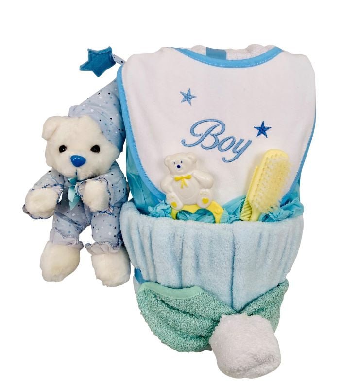 The Boy Pot of Luck is one of our most popular selections for new baby boys entering the world! With an assortment of blue baby accessories and necessities, this adorable creation is the perfect gift to congratulate parents and welcome the new addition! A delightfully sweet flower pot holds an assortment of new baby goodies that every new parent needs. Baby favorites like a blanket, bib, wash cloth, burp pads, brush, comb, bear, rattle, pacifier, and teether- the baby will be spoiled in style! An extraordinary combination of baby boy specific gifts that are arranged and in super sweet style. The perfect gift for new parents, welcoming a new baby, or a baby shower that will definitely get some use and catch some eyes!