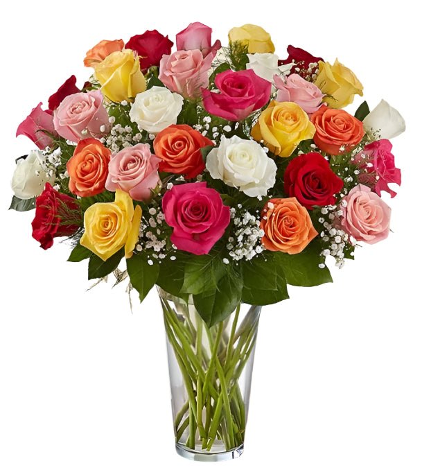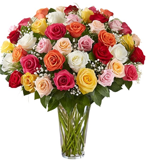 48 Premium Assorted Color Roses Arranged in a vase with filler