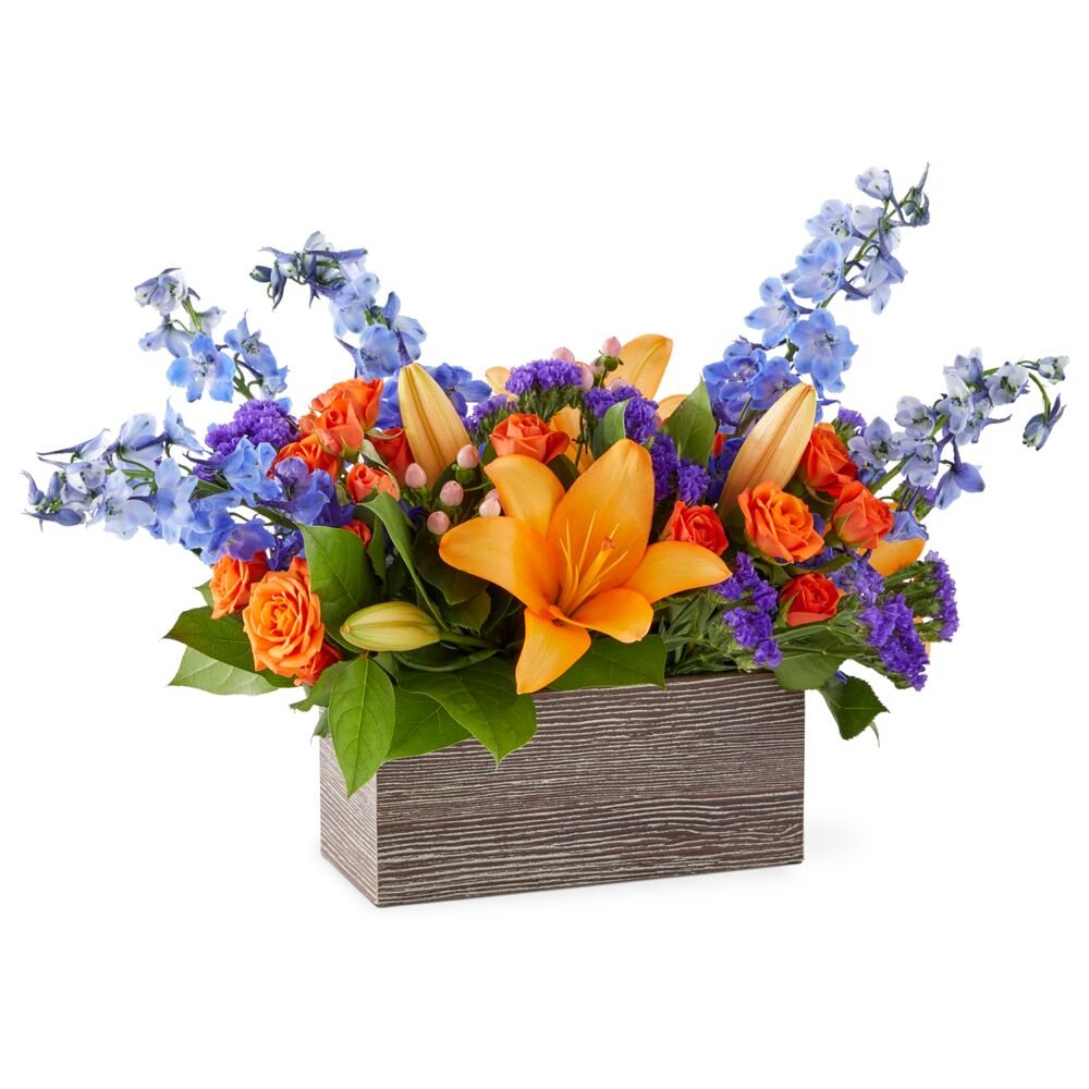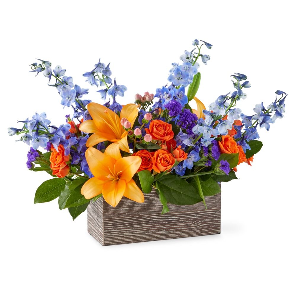 The Radiant Citrus Box radiates warmth and positivity. The low and compact design features a mix of blue and orange flowers in a wooden box. This gift suits a wide variety of occasions from birthdays to get-well wishes.