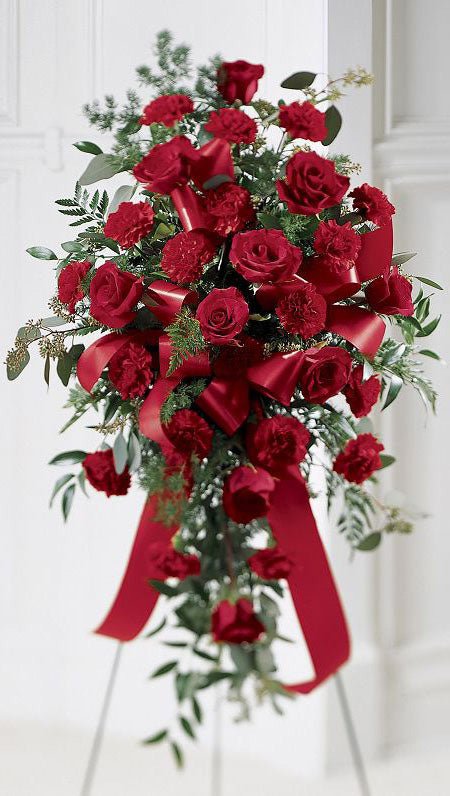 Stunning red carnations and roses are elegantly arranged and accented with a red satin ribbon in this beautiful standing spray arrangement. Express your everlasting love and sympathy with this traditional standing spray arrangement. This arrangement is delivered on an easel for display. Upgrade to medium or large for even more roses and carnations!