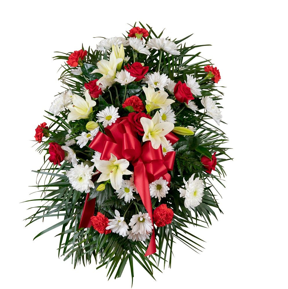 The Red and White Standing Spray contains beautiful blooms, arranged in a classic oval shape. Flowers like lilies, carnations, and mums are accented by red satin ribbon and help to express your sympathies.