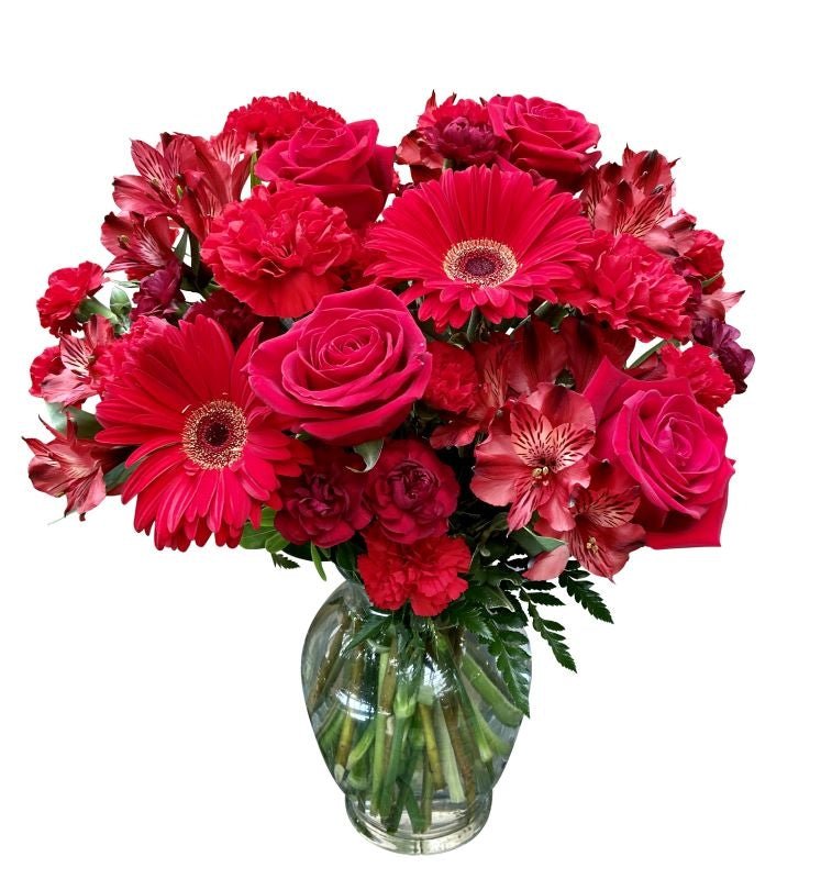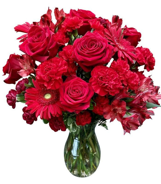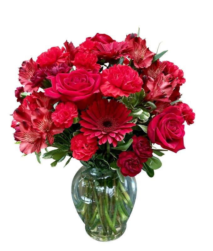 Our Red Blooms Vase is breathtakingly bold and beautiful! This monochromatic display has a way of stealing your recipient's heart after just one glance. One of the most vibrant and deep toned designs we have to offer, this collection of cherry and tomato red blooms captivates any room with its explosion of vibrancy, beauty and personality. Passionate yet sweet, this burst of color and style is unique and original. Hand picked farm fresh flowers in various tones of deep red are arranged within an elegant clear glass vase. With a multi-texture assortment of fresh cut flowers like roses, gerbera daisies, carnations, miniature carnations, alstroemeria and more, your eyes will wander through this sea of red warming your heart and uplifting your energy. The perfect selection to celebrate, love, and appreciate your recipient for any occasion all year round!