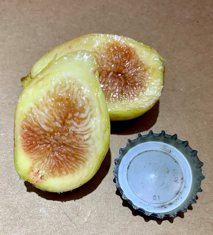 The Rigato del Salento (PB) fig is known for its beautiful green and yellow striped skin. The skin is relatively thick and covers a small, round fruit, about the size of a quarter. Take a bite and you will find a light red or yellow delicious pulp, although color can vary slightly due to climate. This fig is often compared to a variety called Panache, which is another striped fig. However, Rigato del Salento (PB) is said to be even sweeter, with little berry flavor, and a jammy/syrupy texture. Expect PB trees to bear mostly 5 lobed leaves.