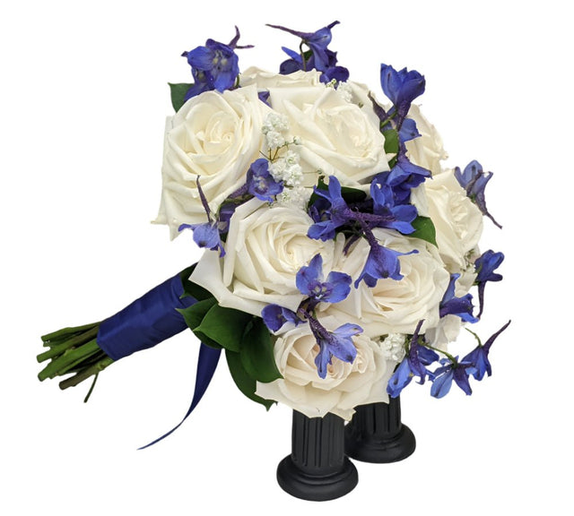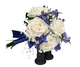 Step into prom night with a bouquet that exudes elegance and charm. Our Roses & Delphinium Clutch Bouquet is a striking combination of pure white roses and rich blue delphinium, creating a stunning contrast that complements a wide range of formal attire.