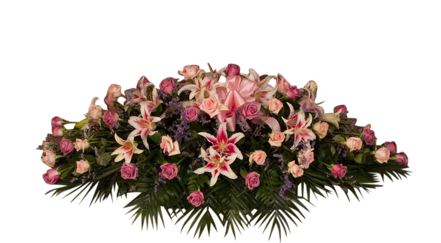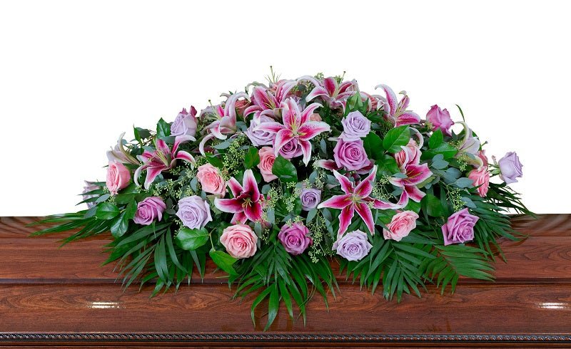 A breathtaking display of assorted pink and lavender roses with stargazer lilies, filler and bow for atop the casket. A magnificent collection of high-end flowers for any funeral service or memorial.